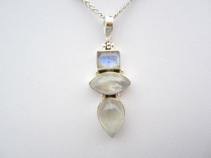 This pendant holds 3 natural moonstone crystal stones. All three have that gorgeous blue flash to it, typical of moonstone, though it appears only one does in the pics. The stones are all nicely polished. The pendant is set in sterling silver.