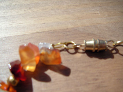 DESCRIPTION: This gorgeous statement bracelet is made with semi-precious carnelian nuggets in hues of orange and is accented with gold plated beads and a barrel clasp. If you would like further information about the carnelian gemstone, please click on the link: http://www.crystalvaults.com/crystal-encyclopedia/carnelianinformation
