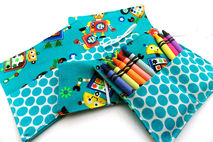 This crayon wallet is Retro-style Robots in teal with polka dot pocket. Perfect for little artists. High quality fabric Handmade