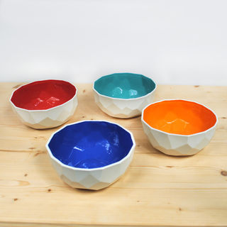 The color on the exterior is high gloss white to emphasize the polygons. Combined with the bright inside colors, this will result in great contrast. Choice of various colors, to combine your own colorful set: Deep Red, Emerald Green, Cobalt Blue and Bright Orange.