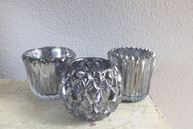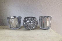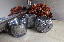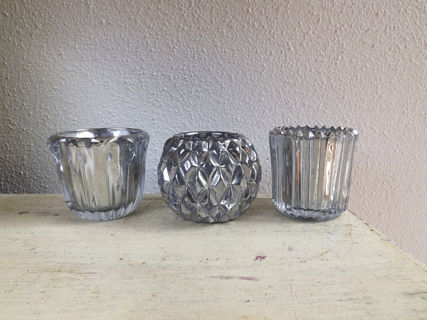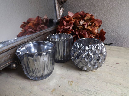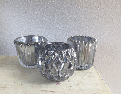 This set of 3 different textured mercury glass votive candle holders have been hand painted and distressed for a mercury glass finish.
