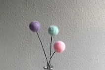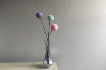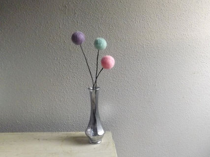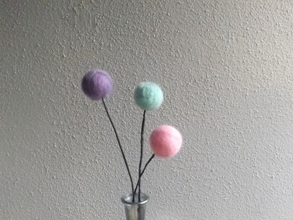 Each wool ball is hand needle felted by me in 3 different shades: lavender, light pink, and minty blue, and attached to an 18 inch wrapped flexible floral wire stem. (vase pictured is not included).