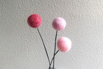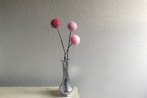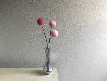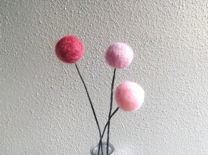Each wool ball is hand needle felted by me in 3 different shades: red, pink, and light pink, and attached to an 18 inch wrapped flexible floral wire stem. (vase pictured is not included).