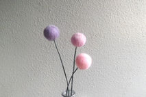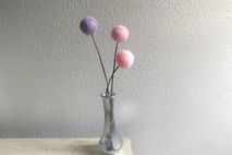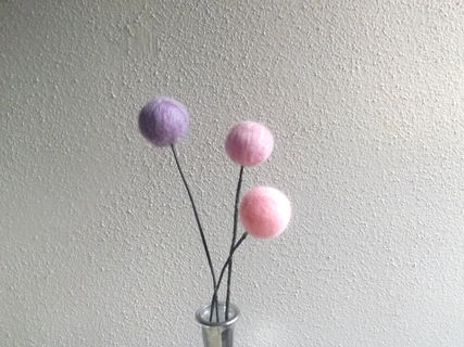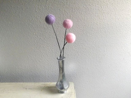 Each wool ball is hand needle felted by me in 3 different shades: lavender, pink, and light pink, and attached to an 18 inch wrapped flexible floral wire stem. (vase pictured is not included).