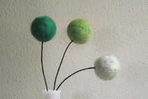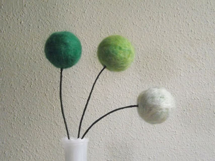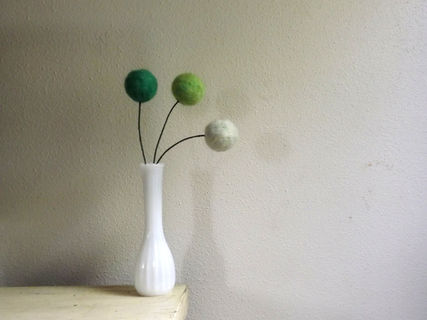 Each wool ball is hand needle felted by me in 3 different shades of green (Cucumber, Kiwi, and Limeade), and attached to an 18 inch wrapped flexible floral wire stem. (vase pictured is not included).