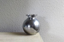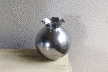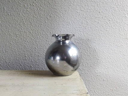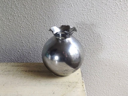 This small round mercury glass vase with ruffled rim is hand painted and distressed for a mercury glass look. It has a beautiful pomegranate - like shape, and is sealed for floral use.