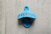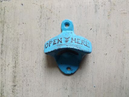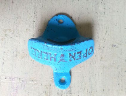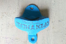 I've hand painted and distressed this cast iron wall mounted bottle opener an aqua or turquoise color.