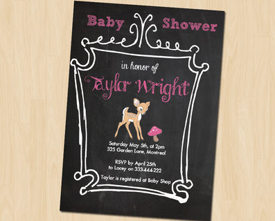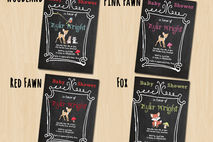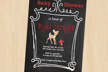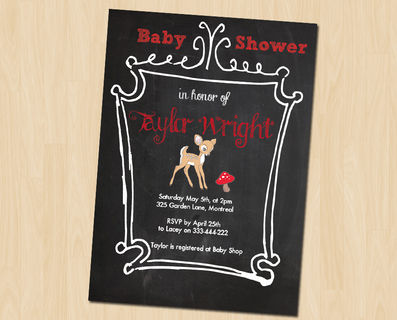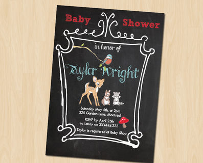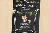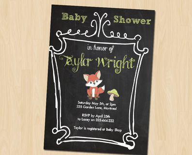 Printable Baby Shower Invitation with woodland Fox on chalkboard background. Perfect for a woodland birthday, baby shower or event.