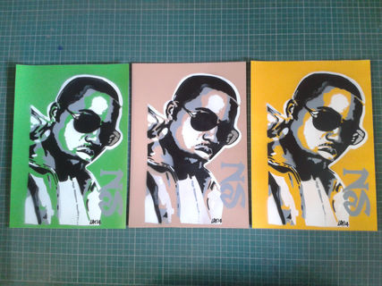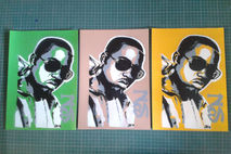 These paintings are made with heavy duty card sprayed in various colours then 3 different hand drawn, hand cut stencils are added afterwards to create a stencil, urban, pop art look.