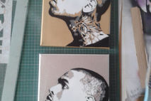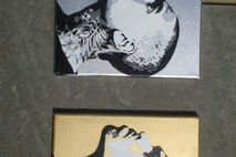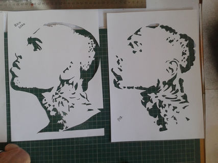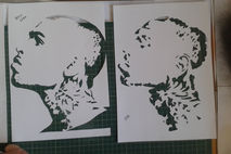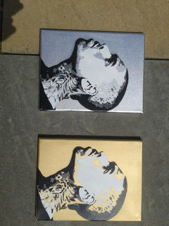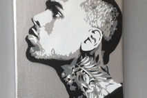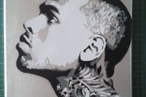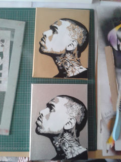 Painted using hand drawn, hand cut stencils and spray paints, silver chrome sprayed canvas with black, white and grey layers added to create face and image of Chris Brown.
