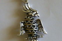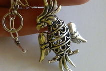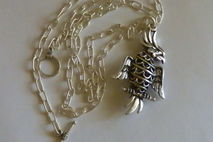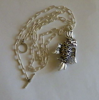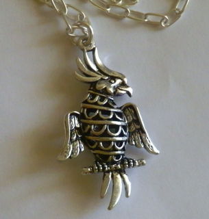 Parrot necklace, highly detailed on both sides, antiqued silver with simple chain, toggle clasp. The parrot is approximately 17/8" long, the chain is approximately 24" long; total length of entire necklace is approximately 26."