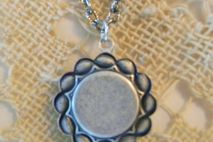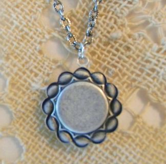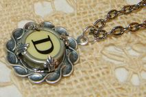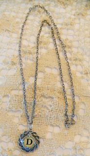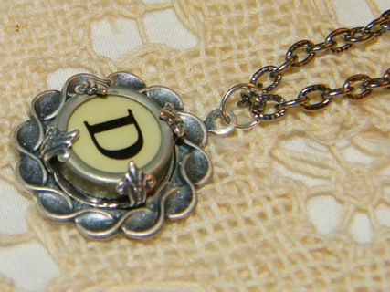 White letter D wrapped and set on a round swirled brushed silver pendant tray. Hangs from a 24 inch antique oxidized silver chain with round clasp. Antique glass top typewriter key D.