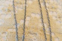 White glass top letter D antique typewriter key in a wrap setting and a swirled brushed silver tray. Hangs from a silver ox chain.