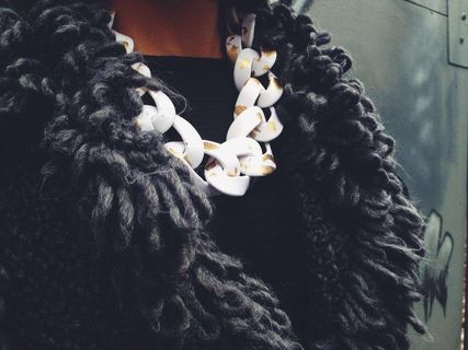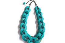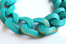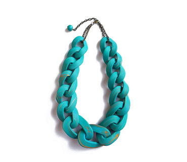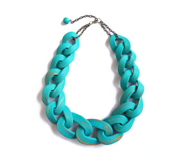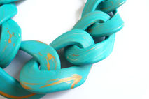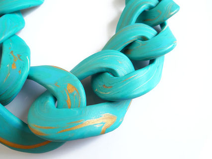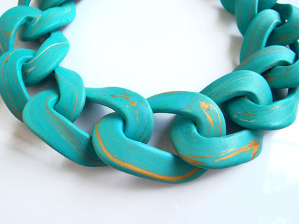 Oversized chunky chain necklace entirely handmade link by link from polymer clay in teal blue with with blue and copper gold streaks, finished with chunky antiqued brass chain and clasp. Unique yet versatile statement necklace, a sure conversation piece to make you stand out in the crowd!