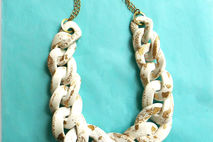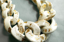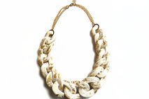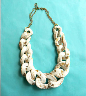 Oversized chunky chain necklace entirely handmade link by link from polymer clay in white, gold speckled with 22 K gold leaf, varnished to a glossy finish and finished with gold plated chain. Unique yet versatile statement necklace in neutral shade, ideal for color matching with various outfits.