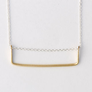 Modern, simple and elegant. A unique line charm is suspended on a lovely chain. Clean and simple. Pendant is 1 1/4" wide. Spring ring clasp.