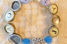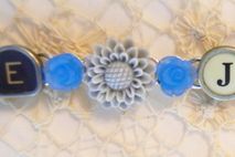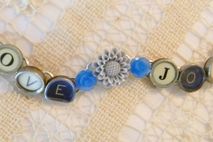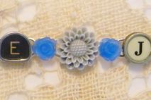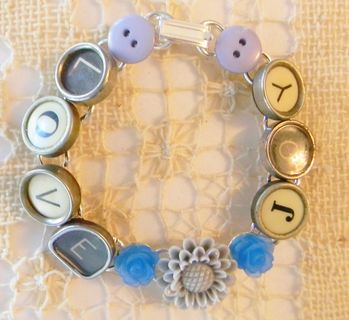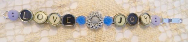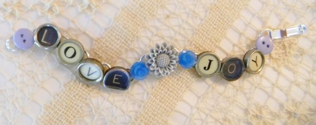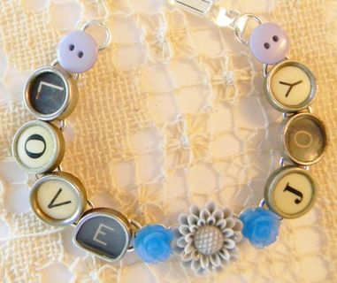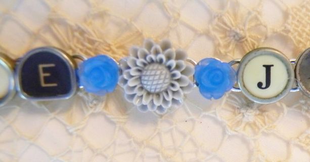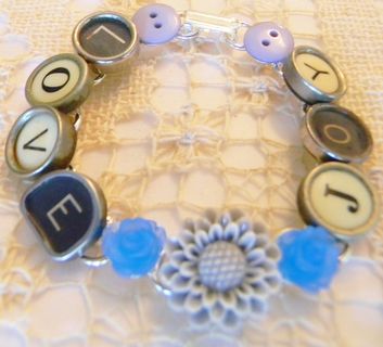 7 1/2" bracelet with "Love" and "Joy" written out in glass top antique typewriter keys from various typewriters, a nice mix of black and white keys. A light gray resin flower, with a smaller blue flower on either side, is between the words and a blue/gray button is at each end. Really cute bracelet made from vintage typewriter keys! The bracelet is silver plated.