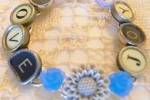 7 1/2" long silver plated bracelet, antique typewriter keys in black and white, resin flowers, old buttons.