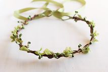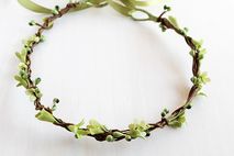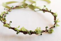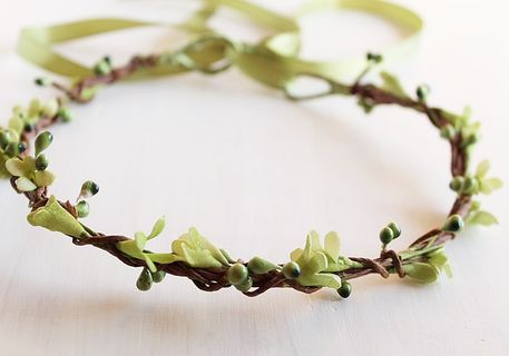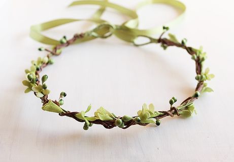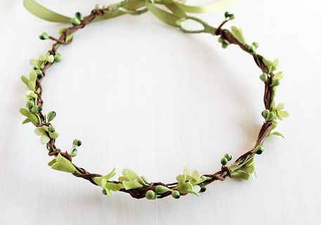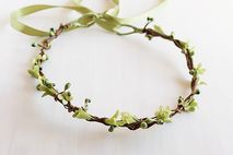 This green floral head wreath is perfect bridal hair accessory for flower girls, brides or bridesmaids. Made of light green artificial floral elements and green pip berries, twined around vine wire base. Olive green satin ribbon ties on the back to adjusts and fit to any head size. Perfect boho floral crown, woodland circlet for summer woodland weddings outdoor weddings, as a festival hair accessory, for rustic, outdoor weddings, garden or festival parties.