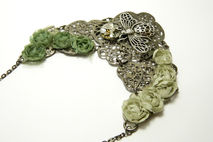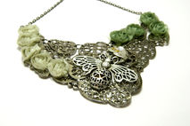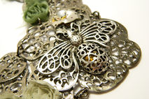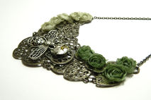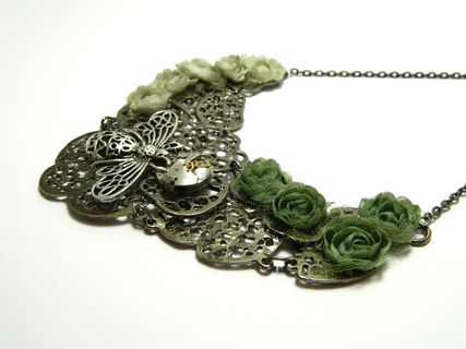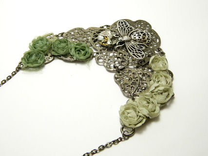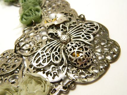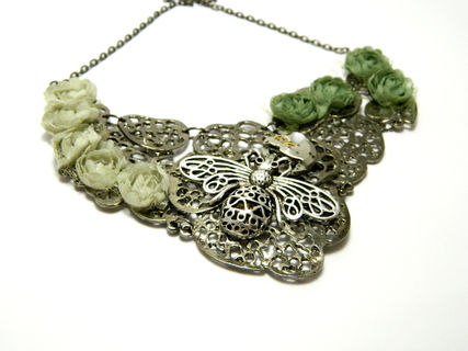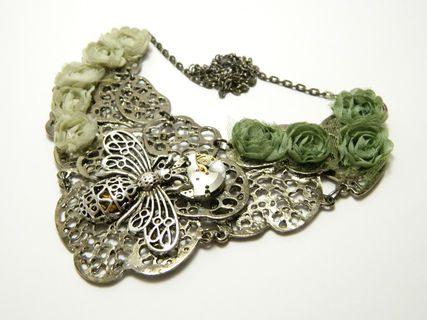 Handmade decorated patina silver colored metal necklace including big bee, old clock mechanism, green and gray fabric flowers.