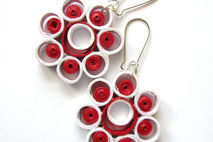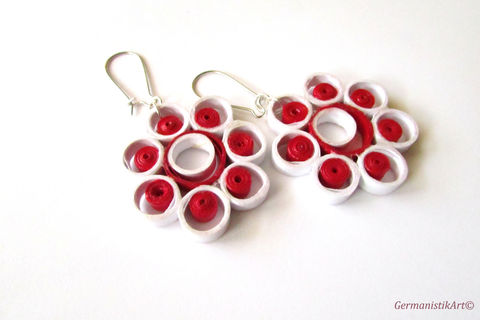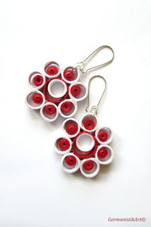 The quilling earrings in red and white are created from quilled paper rolls, glue and transparent acrylic varnish, earring wires.