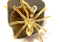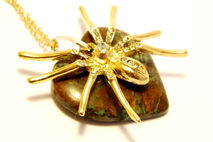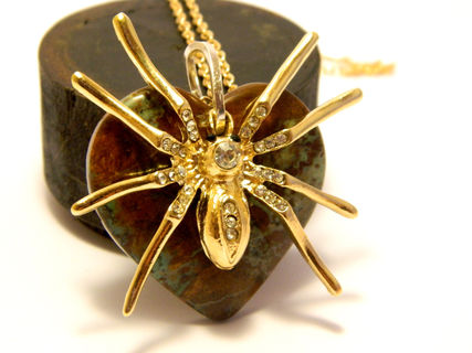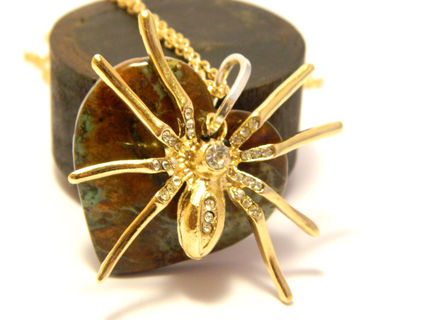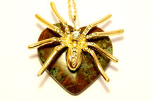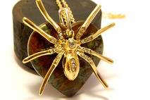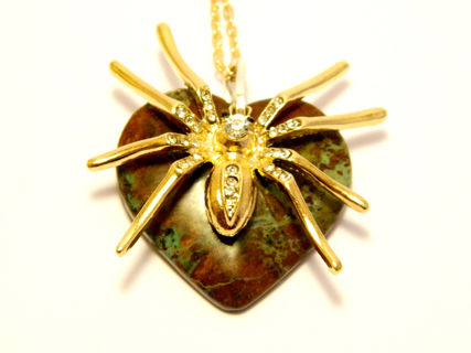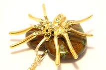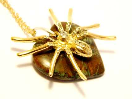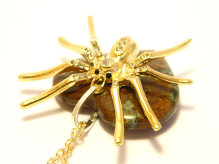 Handmade decorated necklace gold colored spider, golden colored chain, silver colored hoop for contrast, semi-precious gemstone moss agate (also called mocha stone).