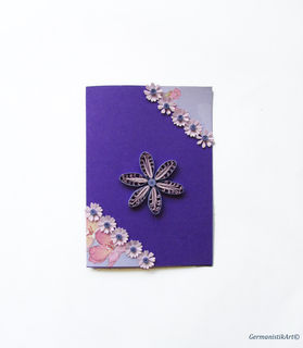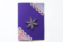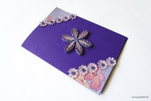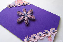 Purple quilling greeting card with quilled flower, decorated with designer paper
