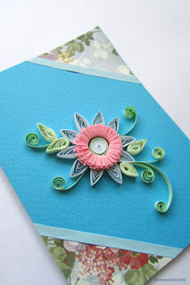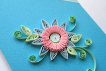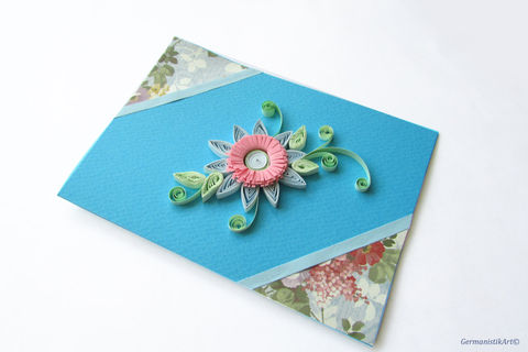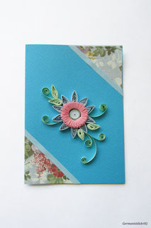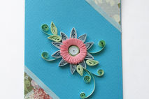 Blue quilling birthday card with quilled flower, decoration with designer paper