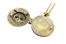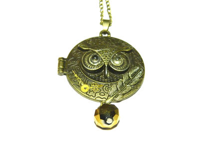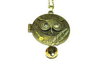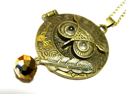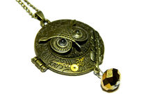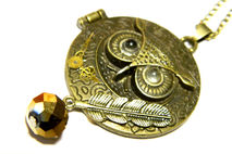 Handmade decorated steampunk necklace owl including mechanical pieces of an antique handwatch, clockwise, feather pen and inkwell.