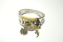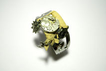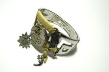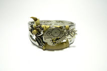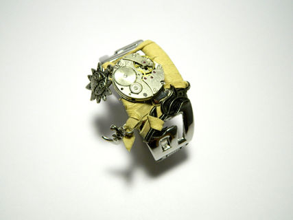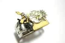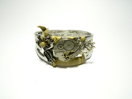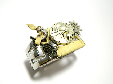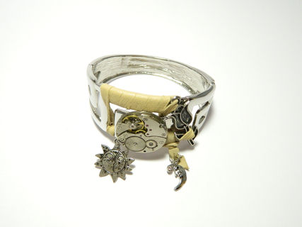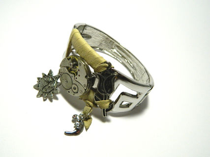 Handmade decorated steampunk bracelet including mechanism of old handwatch. Silver colored bracelet, sun, moon, tulip. Hand carved leather strip.