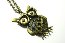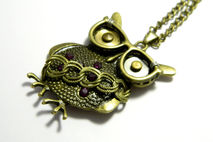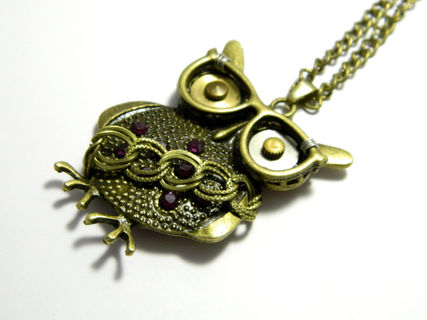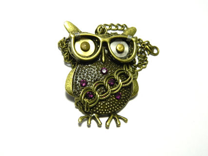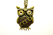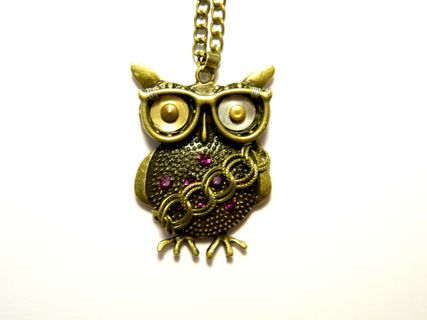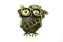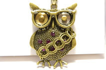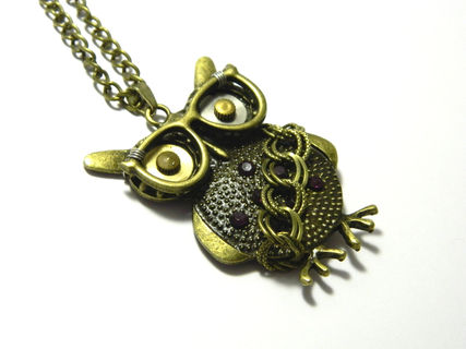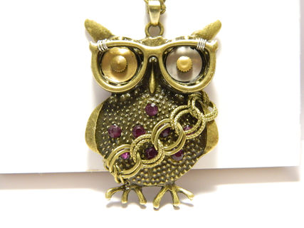 Handmade decorated steampunk necklace including mechanical pieces of an antique handwatch in steampunk owl, glasses, chain.