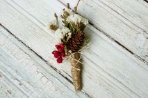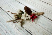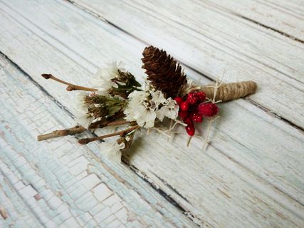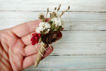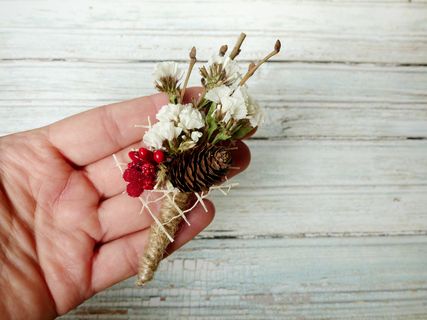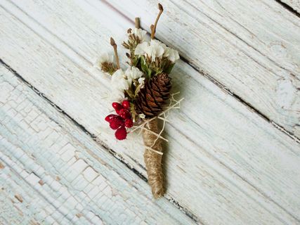This listing is for a single red rustic boutonniere. It is perfect for fall, winter or country themed weddings as well! Made of white natural dried flowers, natural branches, red pip berries, natural pinecone and burlap ribbon.