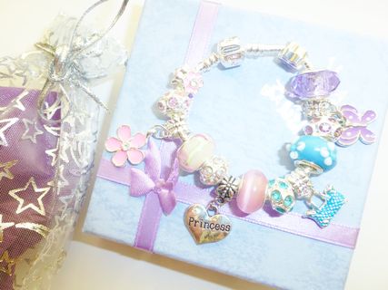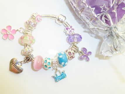 PRINCESS CHARM BRACELET COMPLETE ALL CHARMS MIXED COLOR AS IN IMAGE CHOSEN.. IN GIFT POUCH OR GIFT BOX...