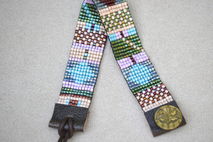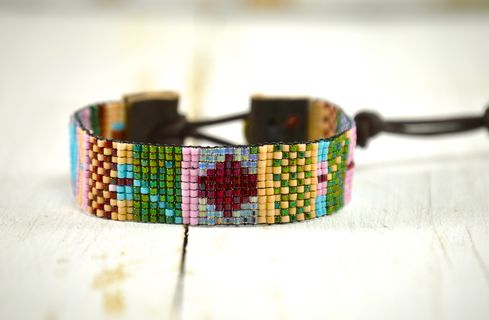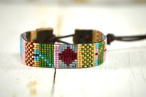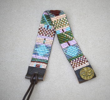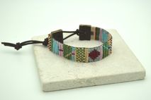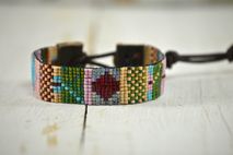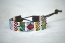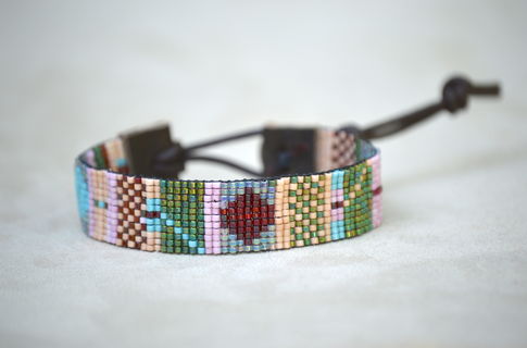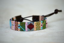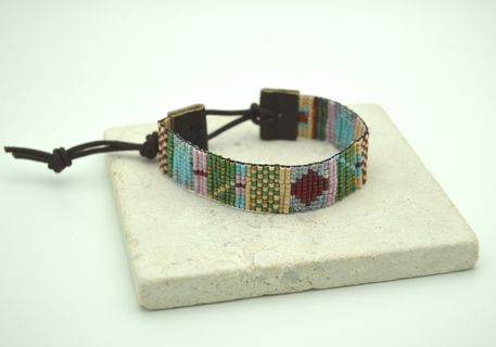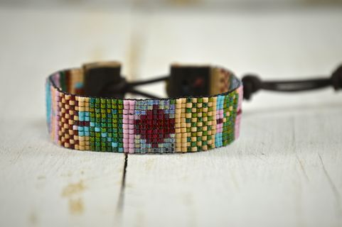Here is a rustic beaded bracelet i made. i used Miyuki Delica Japanese seed beads, designed my own pattern. Turquoise, green, brown and cream beads. Leather endings and an antique metal button closure. This is very light weight on the wrist.