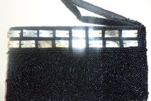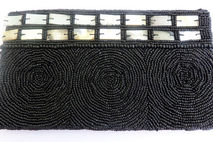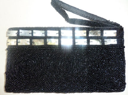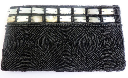 Womens Black Beaded clutch Purse with Shell Design Feature, Satin inlay & Metal Zip