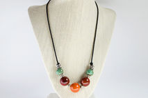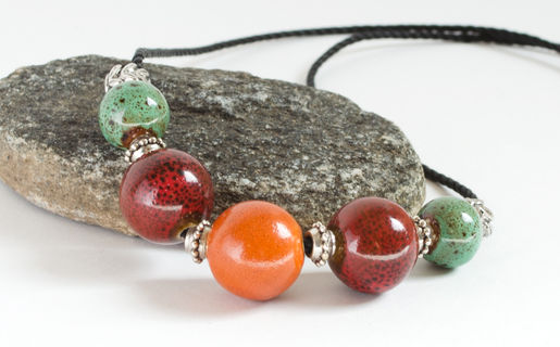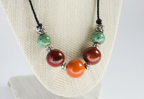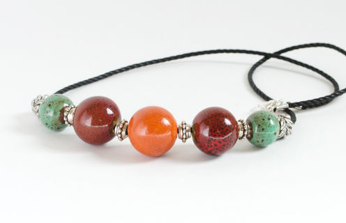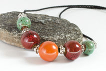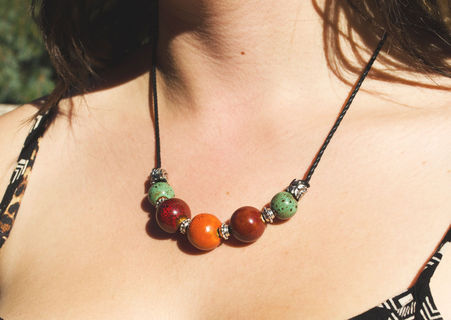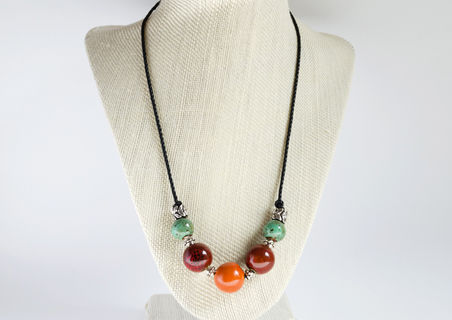This pretty glass bead necklace brings the full colours of fall into your wardrobe and are beautifully speckled giving it a unique appearance. The beads are strung on sturdy black twisted cord and fastened with a lobster claw clasp.