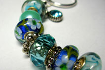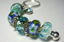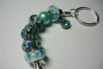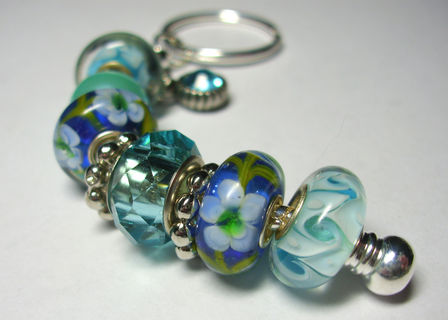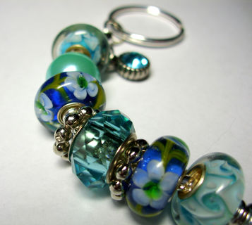 This key chain is made with European charm beads in light blue, some even have the prettiest flowers on them. There is one little light blue sparkle charm. It is about 4 inches long. I can add a clip if you would like.