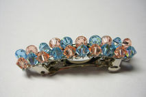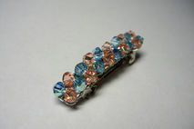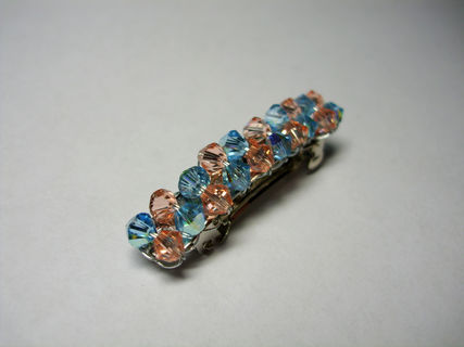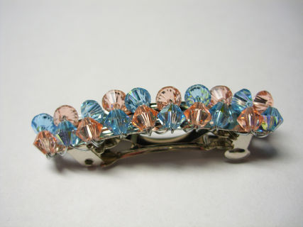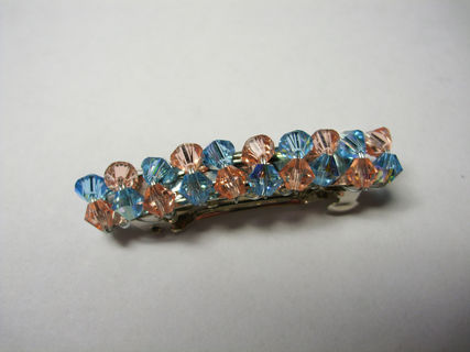 This sparkly barrette has 20 Swarovski crystal beads in peach and light blue. It is about 1.5 inches long.