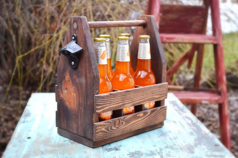 Shown in Red Oak finish and holds 6 bottles. Perfect for beer or soda pop!