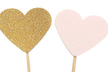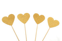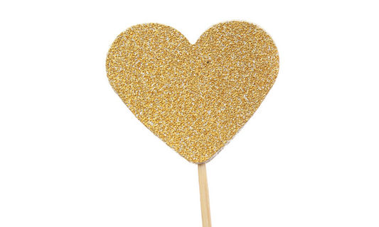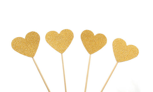 Made from glitter cardstock in gold. Hearts are 1.5 inches and are mounted to 4 inch wooden food picks.