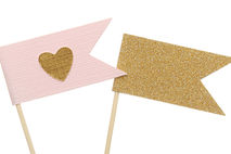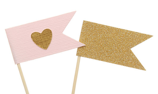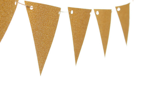 Made from sturdy, textured cardstock and gold glitter cardstock and threaded with beige twine.