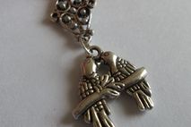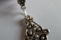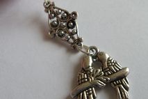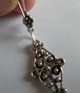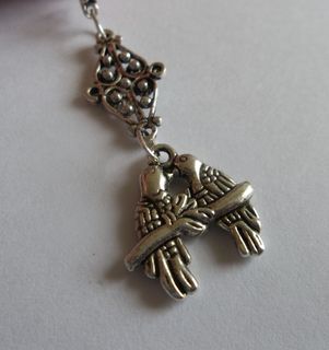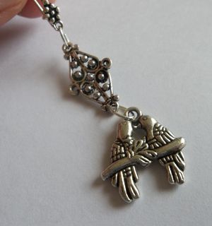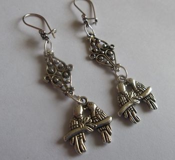 Kissing lovebirds earrings, detailed on both sides, in antiqued silver. The parrots are about 5/8" long and the total length from the top of the ear wire is about 2 1/2."