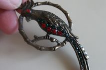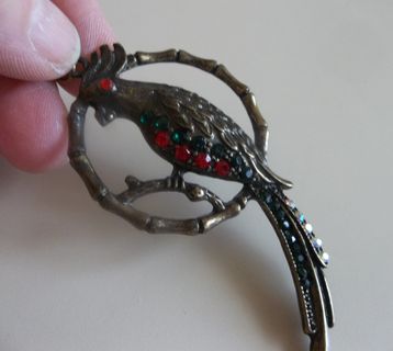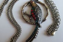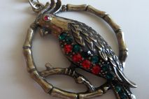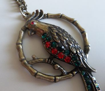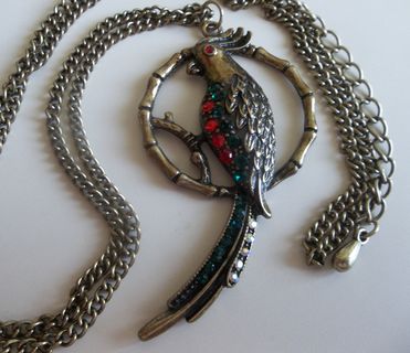 Lovely parrot pendant with multicolored rhinestones; comes with chain. The pendant is 2 3/4" long and 1 5/8" wide. The total length of the chain is 16 1/2" plus a 3 1/2" extension. The pendant is detailed on one side only.