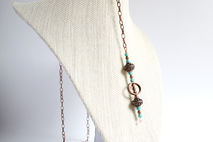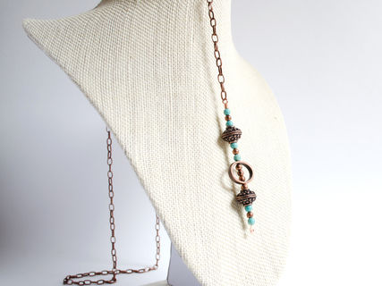 Lariat styled boho necklace with turquoise, in antiqued copper