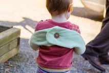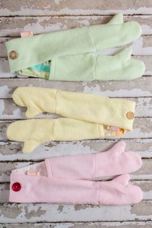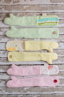 These mitts are one of a kind, and feature warm, double lined polar fleece hand and thumb compartments. The mitts go all the way up the baby’s arm and attach at the back with a flat button. They are adjustable at two settings, so that you can use them for a longer period of time while your child grows. The inside portion of the mitt goes all the way up your child’s arm to the armpit, ensuring that they cannot be pulled off. The inside top portion of your “mittinators” are lined with a beautiful, coordinating vintage fabric.