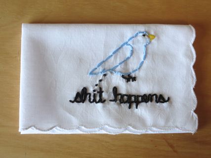 Shit does happen, but it's also good luck if it hits you, right? Hand embroidered, original design by wrenbirdarts, made to order.