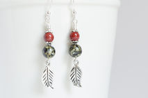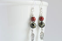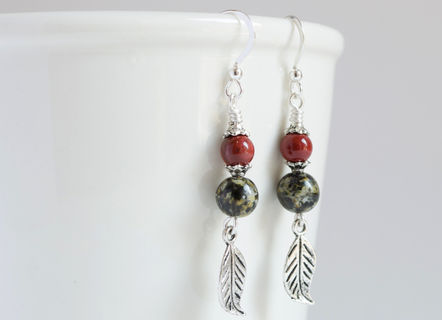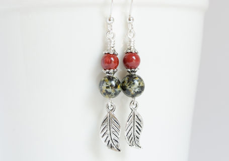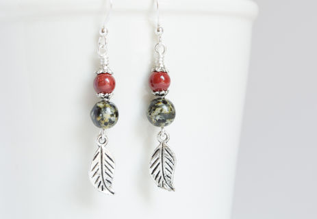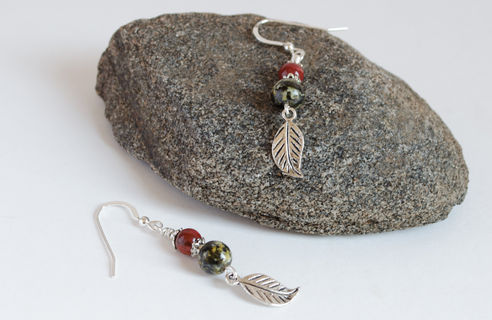Stirling Silver Woodland Leaf Earrings with Red and Green Mookalite Beads