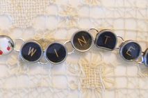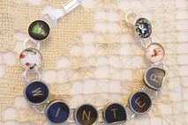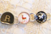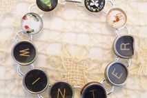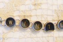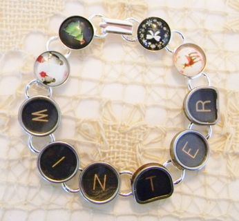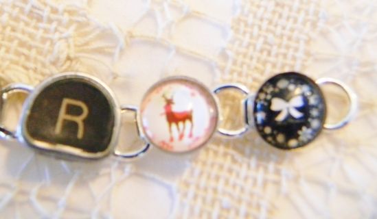 7 1/2" bracelet with "Winter" written out in black glass top antique typewriter keys, round and tombstone shaped, from various typewriters. Christmas themed glass top cabochons include deer, Christmas tree, birds with ornaments and a bow. Really cute winter / holiday bracelet made from vintage typewriter keys! The bracelet is silver plated and has a box clasp.
