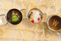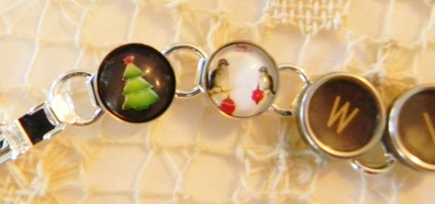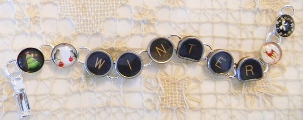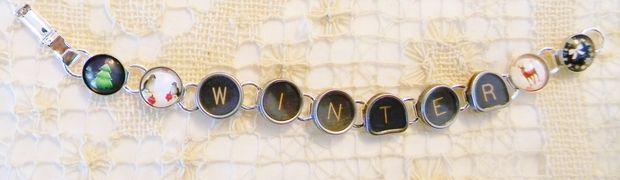 Antique typewriter keys, silver plated bracelet, box clasp, glass top winter and Christmas themed cabochons.