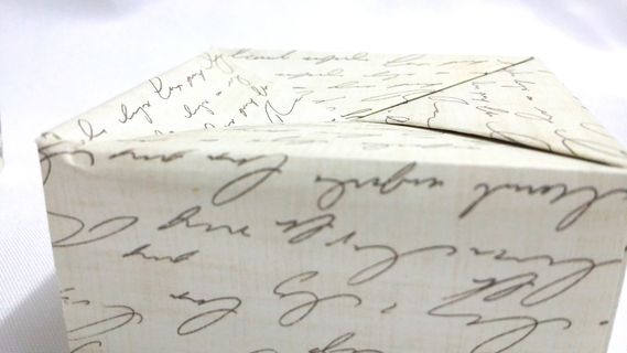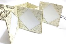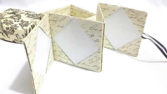 Card is 3" square when closed, but stretches out to about 18" long. The card has 6 diamond shaped areas to write or slide in a photo, plus a blank front 'cover' to write on.